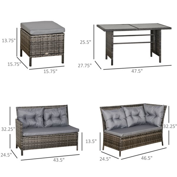 Brighten your backyard with Outsunny’s 6-piece outdoor rattan wicker furniture set and make the outside of your home just as inviting as the inside. Includes 3 corner sofas, 1 table and 2 ottomans, which you can rearrange accordingly.