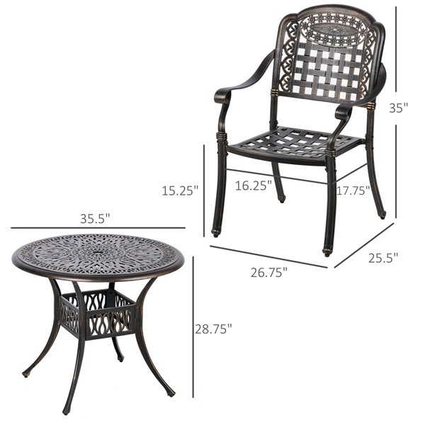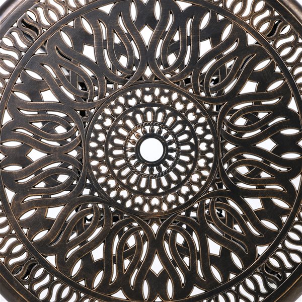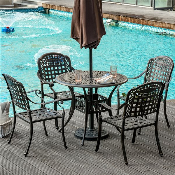 - Built with a 2-in diameter hole in the centre of the table for holding an umbrella