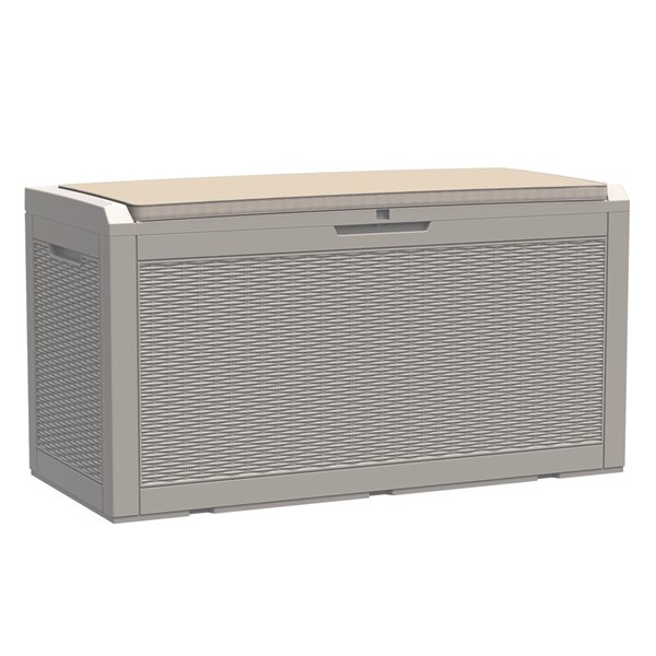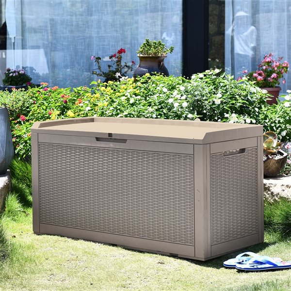 This PP resin rattan storage box is a perfect stylish solution for storing your tools, toys and garden utensils. Made with elegance and style, the durable PP material that replicates the look and feel of a traditional wicker, ensures you durability and stability. Comes with a seat cushion which is strong enough for 2 people sit on the storage box. Suitable for both indoor and outdoor, it is perfectly compatible with various patio sectional furniture set. When not in use, build in two side handles allowing for easy carrying.