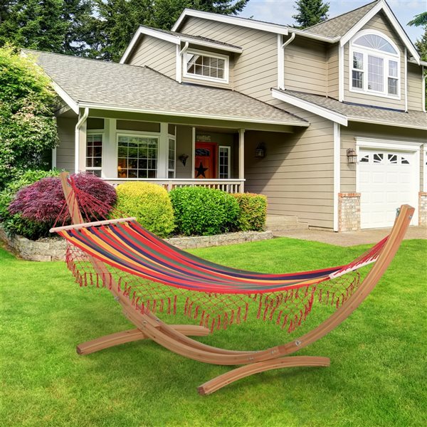 - This heavy-duty backyard hammock with strong hanging straps is weather-resistant