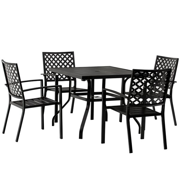 This set of 5-piece outdoor dining set is made of high-quality steel frame, ensuring durability and steady performance. Being an excellent choice for patio, garden area, or backyard dinning use, its modern design and stylish appearance make it suitable for multiple outdoor areas. Choose Outsunny’s outdoor dinning set and enjoy your outdoor meal or gathering with your family and friends.
